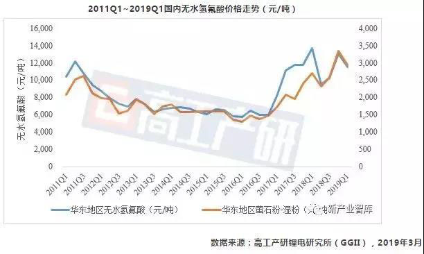 成本方面,2019年無水氟化氫占六氟磷酸鋰總成本34.61%,是后者主要成本影響因素之一。近兩年氫氟酸價(jià)格大幅拉漲,國內(nèi)氫氟酸生產(chǎn)裝置整體開工率僅有六七成,貨源十分緊張。截至2019Q1市場報(bào)價(jià)11553萬元/噸(詳見下圖)。一般而言,氫氟酸每噸上漲3000元/噸,對六氟磷酸鋰的成本影響在1萬元/噸左右。