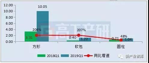 從不同電池形狀來看,2019年第一季度方形電池裝機(jī)電量約10.05GWh,同比增長204%;軟包電池裝機(jī)電量約1.22GWh,同比增長207%;圓柱電池裝機(jī)電量約1.04GWh,同比增長48%。