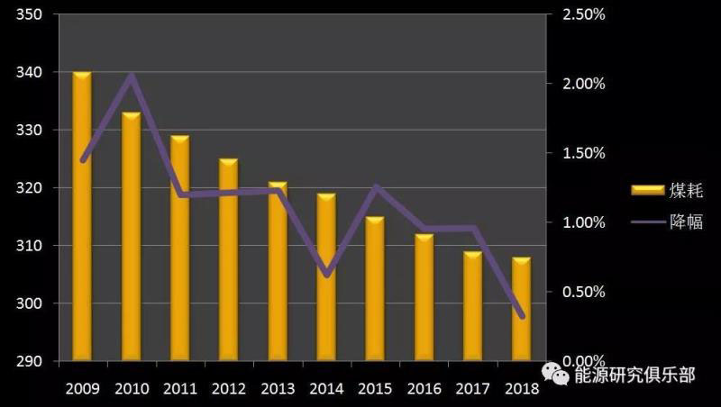 供電標(biāo)準(zhǔn)煤耗持續(xù)下降。按照國家能源局發(fā)布的數(shù)據(jù),2018年全國供電標(biāo)準(zhǔn)煤耗308克/千瓦時,同比再降1克/千瓦時,與2008年的345克/千瓦時相比,全國供電標(biāo)準(zhǔn)煤耗累計下降了37克/千瓦時,呈現(xiàn)明顯下降趨勢。隨著標(biāo)準(zhǔn)煤耗的深度下降,年均減少的幅度開始縮小,但從降幅來看,總體呈現(xiàn)波動中下降之勢。我國燃煤機組煤耗已低于《電力發(fā)展“十三五”規(guī)劃》中“現(xiàn)役燃煤發(fā)電機組經(jīng)改造平均供電煤耗低于310克標(biāo)準(zhǔn)煤/千瓦時”的規(guī)劃目標(biāo)。