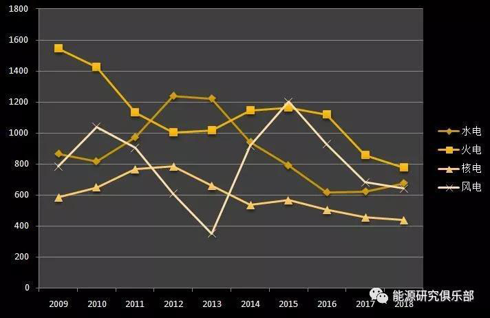 與2017年增速相比,火電投資降幅收窄,仍位居近十年來投資低點。同樣情況的還有核電,一樣是投資低點。水電則有所不同,投資額有所上揚,但仍僅是2012年高峰值1239億元的一半左右,減少565億元。與投資高峰值相比,火電距離2009年投資峰值1544億元減少767億元,核電距離2012年的投資峰值784億元減少347億元,風(fēng)電距離2015年的投資峰值1200億元減少558億元。
