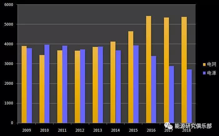 從近十年投資趨勢看,電網(wǎng)、電源投資均有波動,兩者差距在近五年逐步加大。電源投資呈現(xiàn)波動性,2015年之后連續(xù)三年大降,與2015年相比,2018年電源投資減少超1200億元。