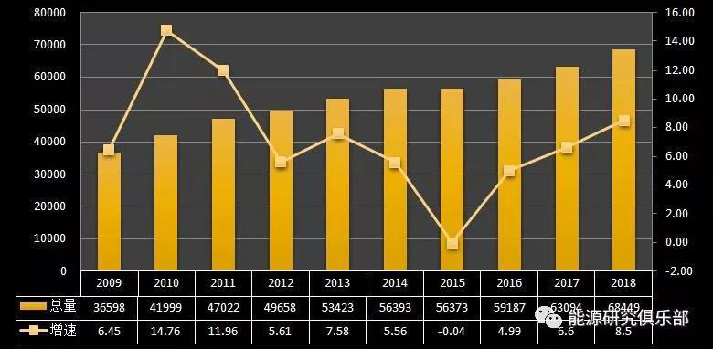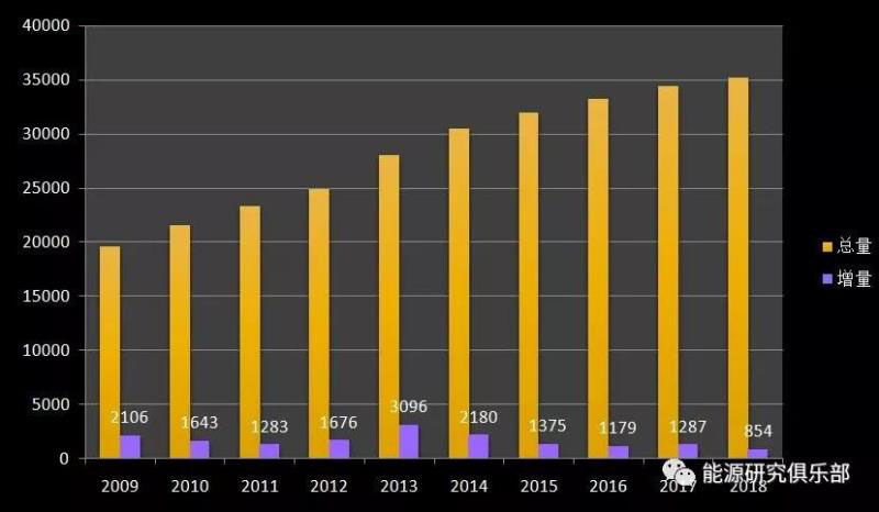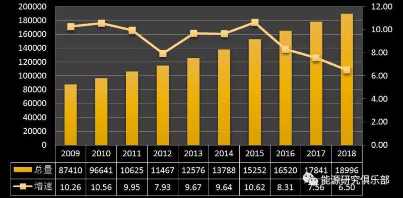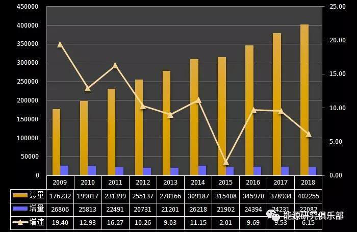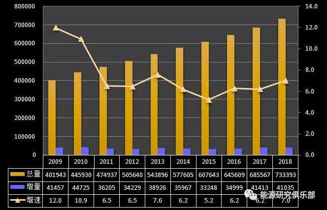 從裝機總量看,2018年底全國電力裝機容量19.0億千瓦,是全球第一裝機大國。從增幅上看,2018年增長6.5%,為近十年來最低?!笆晃濉逼陂g,我國電力裝機持續(xù)在兩位數(shù)以上的高位增速,“十二五”后基本增速不超過10%,2015年增長10.62%是例外。2018年電力裝機增速創(chuàng)新低,與GDP增速6.6%相當(dāng),低于全社會用電增速2個百分點。