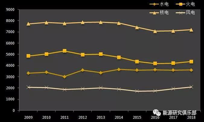 圖15 2009~2018年不同電源發(fā)電設(shè)備利用小時變動情況