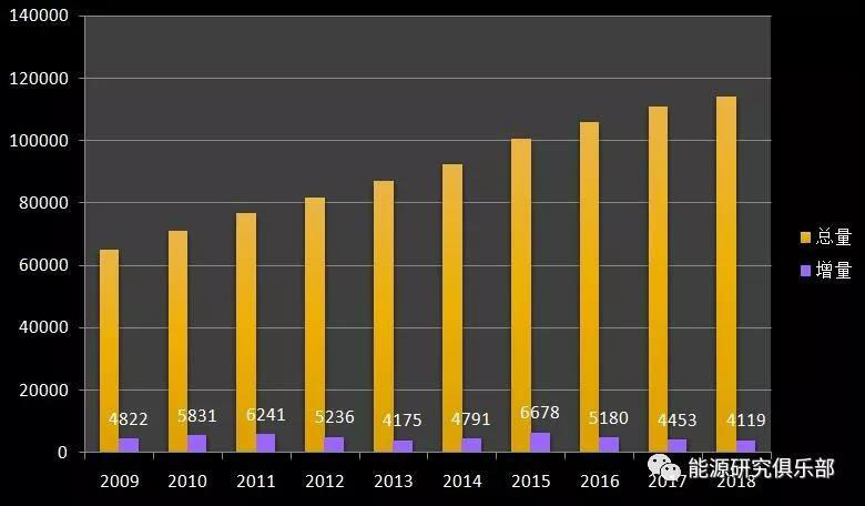 截至2018年底,全國全口徑發(fā)電裝機容量19.0億千瓦,同比增長6.5%,較上年降低1.1個百分點。新增發(fā)電裝機容量12439萬千瓦,比2017年有所收縮,但發(fā)電能力延續(xù)了近六年新增容量超過億千瓦的趨勢。