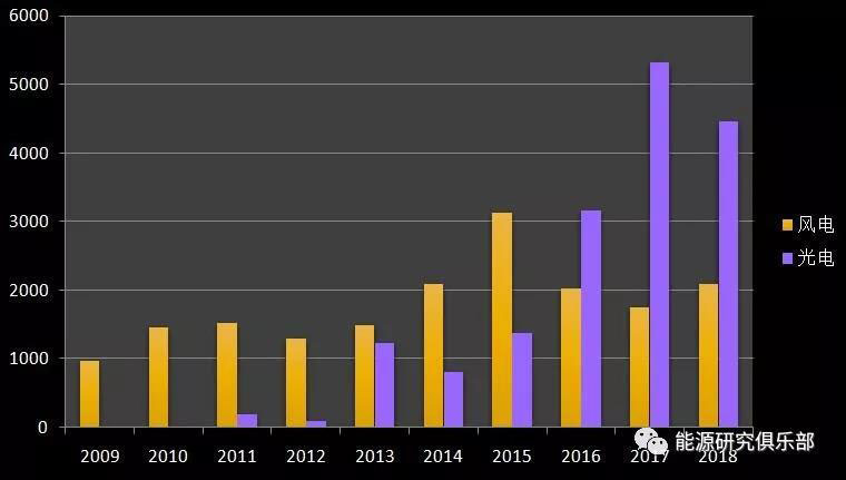 風(fēng)電與光電相比較,風(fēng)電起步早,但后期發(fā)展趨緩,在2015年新增裝機達到3139萬千瓦的歷史高峰后,發(fā)展速度出現(xiàn)回落,但在2018年出現(xiàn)回升。2018年風(fēng)電新增裝機2100萬千瓦,較上年同期多投產(chǎn)355萬千瓦,同比增長20.3%。光電則完全不同,自2009年有官方統(tǒng)計數(shù)據(jù)以來,光伏發(fā)展迅速,年度新增在2016年超過風(fēng)電,2017年差距更大,2018年太陽能發(fā)電新增裝機4473萬千瓦,較上年同期少投產(chǎn)868萬千瓦,同比下降16.2%,增速雖有所減緩,但仍是風(fēng)電新增裝機的2倍有余。