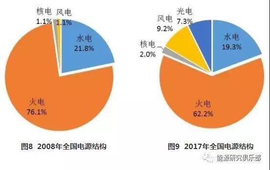 分類型看,2018年水電裝機3.5億千瓦、火電11.4億千瓦、核電4466萬千瓦、并網(wǎng)風(fēng)電1.8億千瓦、并網(wǎng)太陽能發(fā)電1.7億千瓦。與2017年相比,火電占比進一步降低,風(fēng)電、光電、核電占比明顯增加。與2008年相比,十年間,火電裝機占比累計下降近16個百分點,風(fēng)電、光電占比有大幅提升。