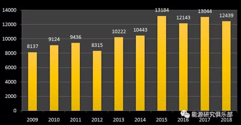 圖7 2009~2018年全國新增電力裝機容量情況(單位:萬千瓦)