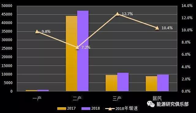 2018年,各產(chǎn)業(yè)用電量均呈現(xiàn)較為強勁的增長勢頭。分產(chǎn)業(yè)看,第一產(chǎn)業(yè)用電量728億千瓦時,同比增長9.8%;第二產(chǎn)業(yè)用電量47235億千瓦時,同比增長7.2%,其中工業(yè)用電量46456億千瓦時,同比增長7.1%;第三產(chǎn)業(yè)用電量10801億千瓦時,同比增長12.7%,延續(xù)兩位數(shù)增長態(tài)勢;城鄉(xiāng)居民生活用電量9685億千瓦時,同比增長10.4%。