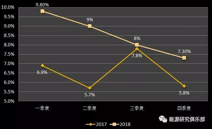 圖2 2017~2018年全國全社會用電量季度增速