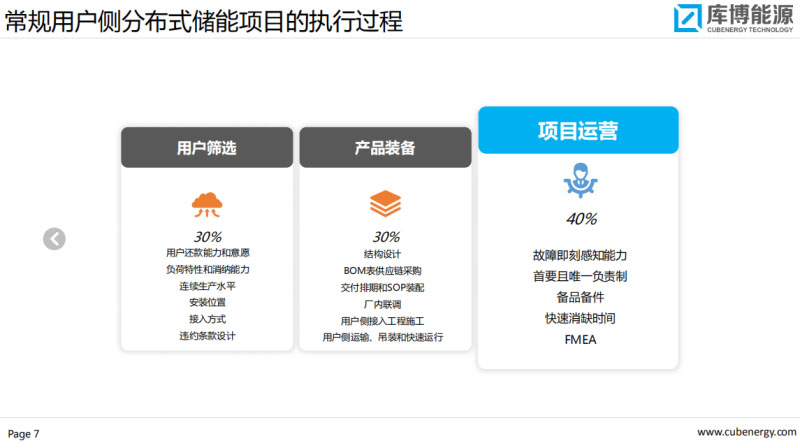 對于一個常規(guī)的分布式儲能項目的開發(fā),從庫博能源的角度看分成了3個階段,分別是用戶篩選,產(chǎn)品裝備,以及項目運營。我對這三個階段分別列了權(quán)重,分別是30%,30%和40%,每個階段都有很明確的任務(wù),和關(guān)注要點。要想讓一個項目能夠執(zhí)行成功,每個步驟都不能省略和偷懶。用戶篩選決定了一個項目是否具備可投資價值,產(chǎn)品裝備決定了一個項目是否能夠輸出盈利能力,而項目運營決定了一個項目能否長期產(chǎn)生持續(xù)現(xiàn)金流,每個條件都只是必要條件,但是三個條件合在一起就成了項目成功執(zhí)行的充分必要條件。用戶側(cè)最核心的問題是現(xiàn)階段國內(nèi)用戶側(cè)的應(yīng)用場景太少,能賺錢的常規(guī)路徑只有一條峰谷轉(zhuǎn)移,不像在歐美可以PDS最大需量削減,ADR需求側(cè)響應(yīng),VPP虛擬電廠,AUX容量輔助服務(wù)等等,這些豐富的場景為用戶找到了很多盈利的路線。反觀國內(nèi),賺錢的地方少,而花錢的地方多,造成成本季度敏感,用戶篩選和過濾也是極度風(fēng)險規(guī)避,這是我們大家正在面臨的問題。當(dāng)然我們也希望將這些問題轉(zhuǎn)化為動力,真正為用戶服務(wù),為電力系統(tǒng)服務(wù)。
