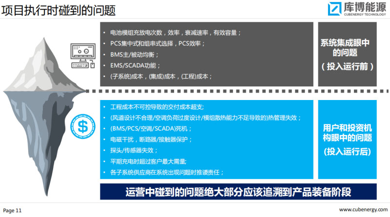 電池模組充放電次數(shù)、效率、衰減速率、有效容量、PCS集中式和組串式選擇,BMS主被動均衡,EMS、CSADA功能,最后是成本!成本!成本!所以我們開始的時候投入運行前考慮的問題,事實上是技術(shù)的問題,投入運行后會發(fā)現(xiàn)哪些問題呢,開個玩笑說都是雞毛蒜皮的事情,可能一個傳感器1.8毛錢,影響2天、3天的時間,造成的收益損失高達(dá)1萬、2萬,這些問題都不是我們前面看到的,都是運行的時候看到的,電池干擾、短路器、接觸器保護(hù)、探頭、傳感器失效,平期充電時超過客戶最大需量,各子系統(tǒng)供應(yīng)商在系統(tǒng)出現(xiàn)問題時推諉責(zé)任,集成的過程中投入運行后我們會發(fā)現(xiàn)有各式各樣的問題。我們目前總結(jié)和定義來說,運營中碰到的問題絕大部分應(yīng)該追溯到產(chǎn)品裝備的階段。