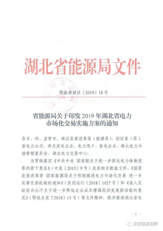 2019年5月5日,深度能源觀察獲悉,湖北省能源局發(fā)布《2019年湖北省電力市場(chǎng)化交易實(shí)施方案》,《實(shí)施方案》提出: