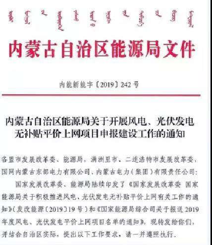 日前,內(nèi)蒙古自治區(qū)能源局下發(fā)通知,要求各地上報(bào)無(wú)補(bǔ)貼風(fēng)電、光伏平價(jià)上網(wǎng)項(xiàng)目。通知提出:橙色地區(qū)只允許存量項(xiàng)目轉(zhuǎn)平價(jià),綠色地區(qū)鼓勵(lì)存量項(xiàng)目轉(zhuǎn)平價(jià),允許報(bào)新項(xiàng)目。