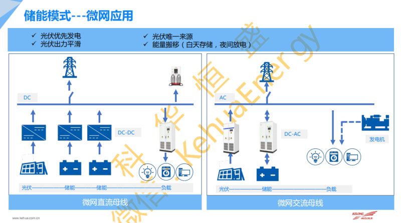 這是我們在離網(wǎng)這一塊的內(nèi)容。另外談到微網(wǎng)應用,其實在微網(wǎng)應用有兩種模式,一種是DC方案,一種是AC方案。各有優(yōu)勢和劣勢。比如說交流方案,從直流方案來看,它的好處是直流相比來說接入點不一樣。它接入的直流是有一個電壓,正負極的區(qū)別。但是交流不一樣。從整個的結構來看,直流又存在另外一個問題。因為直流的保護,本身技術沒有零點,保護措施是有差異的。第二個問題在于大、微電網(wǎng)。微電網(wǎng)和大電網(wǎng)的區(qū)別就是小跟大的區(qū)別。小的情況下,可以看一下這邊做的微電網(wǎng),核心點全部是電力電子器件,沒有所謂的發(fā)電機。這種情況下我們都知道,電力電子產(chǎn)品的特性完全不一樣。做電力穩(wěn)定的時候,考慮的不光是靠EMS可以搞定的,是靠器件的本身。直流有一個好處,其實像電池是不需要轉換的。這個時候你的尺寸就會做得很大。但是還有缺陷。缺陷在于我們直流這一塊的保護傳輸。相比交流的傳輸是有一定瓶頸的。