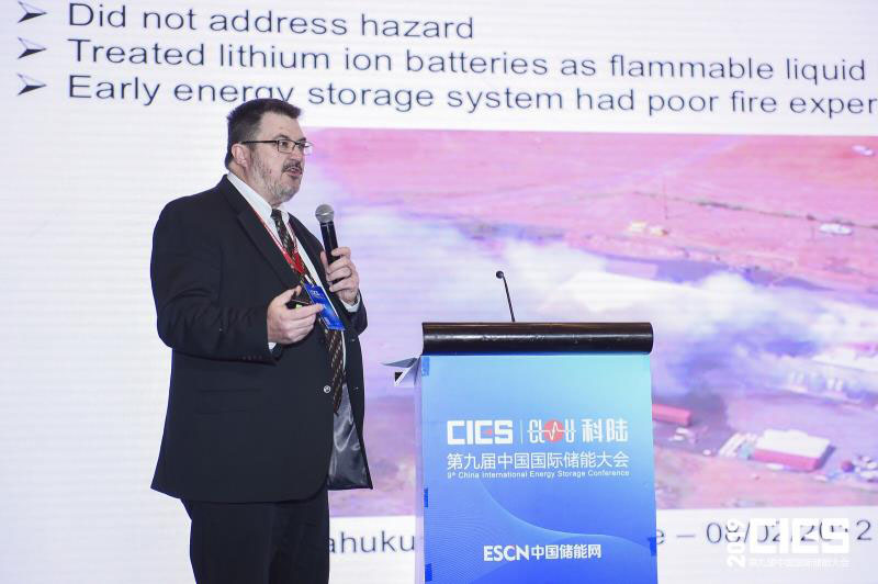 中國(guó)儲(chǔ)能網(wǎng)訊:4月24-26日,由中國(guó)化學(xué)與物理電源行業(yè)協(xié)會(huì)儲(chǔ)能應(yīng)用分會(huì)主辦的第九屆中國(guó)國(guó)際儲(chǔ)能大會(huì)在浙江省杭州市洲際酒店召開。在4月24日下午的“國(guó)際儲(chǔ)能市場(chǎng)與政策專場(chǎng)”,美國(guó)儲(chǔ)能系統(tǒng)技術(shù)委員會(huì)主席、TüV 南德意志集團(tuán)全球風(fēng)險(xiǎn)顧問公司常務(wù)顧問James Biggins先生在會(huì)上分享了主題報(bào)告《儲(chǔ)能電站的損失預(yù)防措施》,以下為演講實(shí)錄: