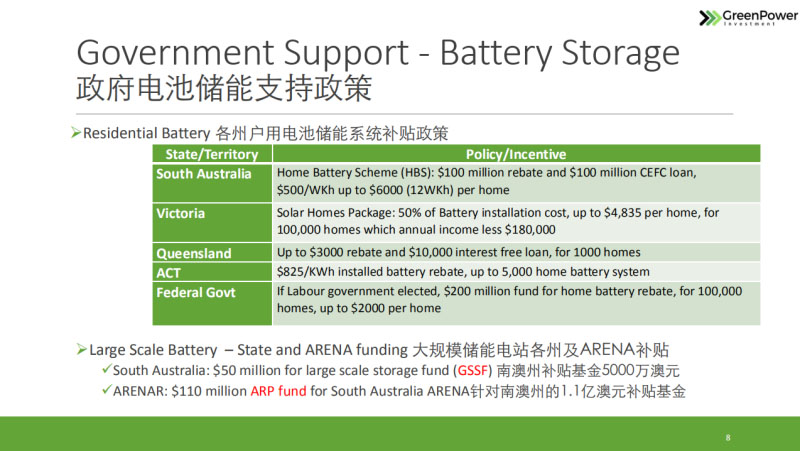 這個(gè)就是我們自己開發(fā)的項(xiàng)目,我們比它還大,就是200兆瓦和100兆瓦小時(shí)的電網(wǎng)測儲(chǔ)能項(xiàng)目。剛剛提到為什么要去南澳做這個(gè)事?有很多的好處,有50%再生能源,比如說光伏還有風(fēng)能,需要電池來支持它,天不刮風(fēng)怎么辦、陰天怎么辦,風(fēng)能太多的話政府交易平臺(tái)要罰款的,政府拿出5000萬,ARENA也是發(fā)放基金的組織,這些錢不是都給我們的,有它其中的一部分,使我們?cè)谶@個(gè)南澳的投資技術(shù)上面和投資回報(bào)上面增加了很多的信心。據(jù)我們知道,中國也參與了,北控也在南澳正在運(yùn)作一些事情.這是我們大電池項(xiàng)目的基本概況,剛剛說不少的,我們是它前期投資的投資者,收到的政府的支持。