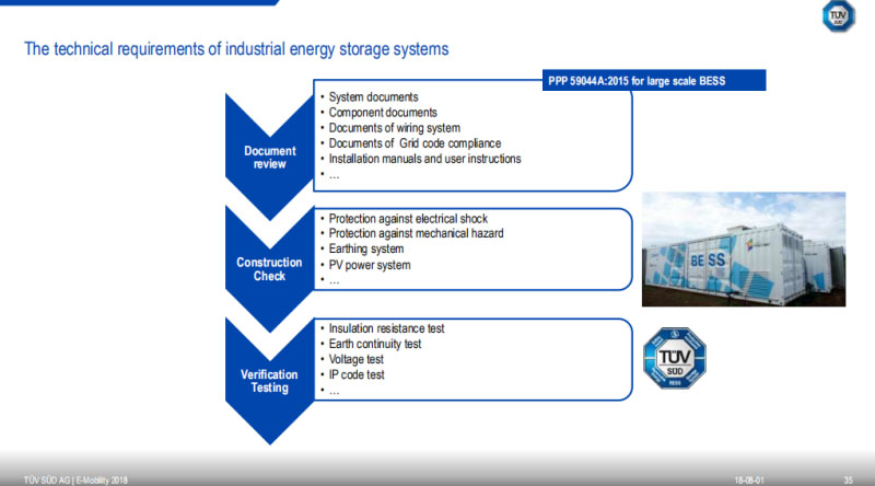 對于上述這些市場,,如果遇到了一個沒有標準的地區(qū)或者市場的話,其實我們只要把剛剛看到的那些準則作為參照就可以了。所以說我們可以把TüV SüD的認證、TüV SüD的測試百分之百用在你的系統(tǒng)上,這也是一種保障。我們的這個LOGO是全球性的,是國際性,但是不是全世界都認識它,在美國可能有部分人認識它,在歐洲基本上全部都認識它,就是我們的LOGO。我們還有專門給大規(guī)模儲能系統(tǒng)或者是家用儲能系統(tǒng)認證。對于研發(fā)測試、性能測試、可靠性測試、安全性測試,我們在全世界都可以進行,尤其在北美、歐洲、韓國、中國,明年在泰國還將建立一個大的電池實驗室。同時,在電池檢測上面我們有著相當豐富的經(jīng)驗,我們目前已經(jīng)測試過超過6000款不同的電池,以前主要是在動力電池方面進行測試,近年來也在ESS電池方面進行測試。這個是一個大電池實驗室,它提供一個安全的環(huán)境,因為電池是會有爆炸情況出現(xiàn)的,會使電池處于超出極限情況。在一個極端情形去做測試,我們可以在這個安全玻璃前面觀看這個電池從最初的情況到極端情況整個的變化過程。