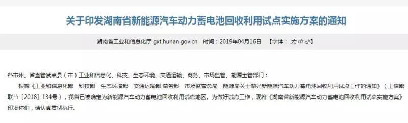 為加快推進新能源汽車動力蓄電池回收利用試點工作,構(gòu)建新能源汽車動力蓄電池回收利用體系,近日,湖南省發(fā)布了《關(guān)于印發(fā)湖南省新能源汽車動力蓄電池回收利用試點實施方案的通知》。