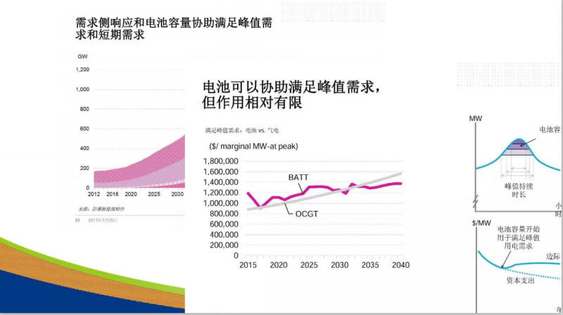 更多的資源怎么用呢?從這個發(fā)電系統(tǒng)運行層面,市場機(jī)制負(fù)荷靈活發(fā)電,這個電網(wǎng)儲能各個方面我們都認(rèn)為要發(fā)揮作用,但是我們也看一下這個成本,縱軸成本應(yīng)該說是目前為止我們要更多的利用低成本的一些技術(shù),包括一些標(biāo)準(zhǔn),市場設(shè)計,負(fù)荷響應(yīng),靈活性來提升。現(xiàn)在這個火電的靈活性也在全面的推開,大范圍的電網(wǎng)互聯(lián)在增加,右側(cè)的儲能我們認(rèn)為現(xiàn)在儲熱簡單易行的,在北方地區(qū)供熱系統(tǒng)可能做了一些嘗試,增加一些儲熱能力,學(xué)習(xí)丹麥的經(jīng)驗。這個電站也是最主要的資源,化學(xué)儲能按照目前的這種是幾年前做的,按照目前這種成本是成本比較高的,隨著儲能技術(shù)下降,這個成本要往下降。更多的利用成本越來越高的一些技術(shù),儲電目前看來比較高的,隨著比重的增加儲能發(fā)揮著越來越多的作用。大部分儲能在協(xié)同發(fā)展?jié)摿Γ褡髠?cè)這個圖是可再生能源發(fā)電的比重,占到的絕大部分的比重,右側(cè)電動汽車是重要的一個將來儲能的潛力市場,分析到2050年的時候,全部的新興車都是這個電動化的汽車,當(dāng)然包括一些氫燃料汽車我們認(rèn)為要發(fā)揮作用的,未來這個潛力比較大的,我們做了相關(guān)的一些分析,這個圖應(yīng)該上面是發(fā)電側(cè),橙色部分是波動性的風(fēng)電加光伏。下面這個圖是需求側(cè)的,整合的負(fù)荷再加上我們這個電動汽車的靈活的一些智能的充電,我們看一下就是這些新能源電動汽車怎么協(xié)同的,發(fā)揮的機(jī)制是什么?是價格,供需還有價格。這個黑色的線就是價格,隨著這種電力供需供應(yīng)過剩白天的時候,太陽能幾十億甚至二十億千瓦的光伏出電的時候,動力供應(yīng)是充足的,甚至過剩的。那個時候價格是充電的,光伏下降的時候,供應(yīng)相對不足的,那個時候充電就是價格的充電時間要轉(zhuǎn)移的。