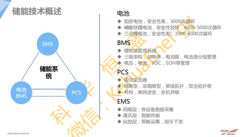 我們的電池管理系統(tǒng)是必不可少的。要提高電池在儲(chǔ)能使用中的性價(jià)比?,F(xiàn)在主要的BMS的應(yīng)用主要分為三級(jí)架構(gòu),主流技術(shù)路線都是三級(jí)架構(gòu)。對(duì)單體、電池簇以及電池堆分級(jí)管理。主要是電壓、電流、SOC、SOH進(jìn)行管理。電池是直流電,連接到電網(wǎng)必不可少的就是PCS。PCS就是將直流電轉(zhuǎn)換為交流電,再轉(zhuǎn)換為直流電,就是雙向變流器?,F(xiàn)在市面上有隔離型的,可能多用于用戶側(cè)。還有一些非隔離型的,用于發(fā)電測(cè)和電網(wǎng)側(cè)。還有一些單級(jí)拓?fù)浜碗p級(jí)拓?fù)?。還有包括在這次會(huì)議中也聽說了很多新的技術(shù)路線,比如不需要變壓器可以直接升壓。PCS關(guān)鍵技術(shù)主要是并網(wǎng)運(yùn)行和離網(wǎng)逆變包括并離網(wǎng)之間的切換還有多機(jī)并聯(lián)的技術(shù)以及VSG虛擬同步機(jī)技術(shù)。最后,是儲(chǔ)能系統(tǒng)必不可少的一個(gè)管理系統(tǒng)就是EMS。一個(gè)就是采集層,對(duì)于儲(chǔ)能系統(tǒng)里面的設(shè)備進(jìn)行采集。接下來就是通訊層,還有站控層,實(shí)現(xiàn)策略的運(yùn)算和指令的下發(fā)。
