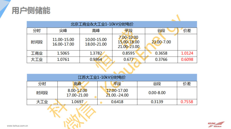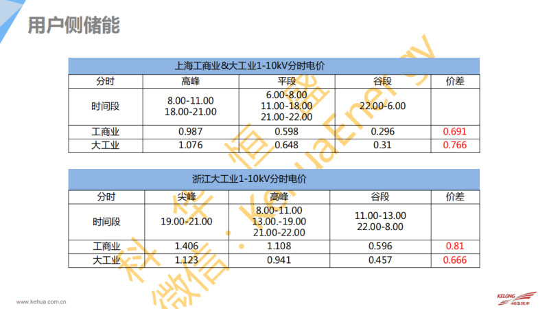 這是我們對(duì)于用戶側(cè)儲(chǔ)能的分析。在用戶側(cè),電網(wǎng)有電的時(shí)候PCS做一些削峰填谷的應(yīng)用。我們的儲(chǔ)能系統(tǒng)給廠區(qū)里面的主要負(fù)荷來供電,主要大頭是削峰填谷的收益,如果變壓器的需量情況比較特殊也可以通過控制這個(gè)。還有負(fù)荷平滑還有應(yīng)急供電這樣一些隱形收益。目前相對(duì)來說峰谷差價(jià)比較好可能集中在北京、江蘇和上海。這邊是對(duì)現(xiàn)在北京、江蘇、上海峰谷差價(jià)做的調(diào)整。江蘇的工業(yè)差價(jià)會(huì)好一點(diǎn),大概有0.75元。上海和浙江的大工業(yè)的電價(jià)差,上海的大工業(yè)電價(jià)差也不錯(cuò),有0.76。這是我們針對(duì)杭州地區(qū)做的一個(gè)初步峰谷預(yù)算。這邊有一個(gè)隱形的因素,能不能做一些需量的調(diào)節(jié)。這邊對(duì)需量沒有做詳細(xì)的計(jì)算,主要是峰谷差價(jià)的計(jì)算。在峰谷差價(jià),因?yàn)楹贾莓?dāng)?shù)氐募夥鍟r(shí)刻是兩小時(shí)。假設(shè)配500kW和1.25MWh的系統(tǒng),這樣算下來其實(shí)投資和收益的成本并不能做到一個(gè)很好的很可觀的投資收益。在這樣的系統(tǒng)中主要影響因素可能是設(shè)備的一些充放電效率還有設(shè)備成本。