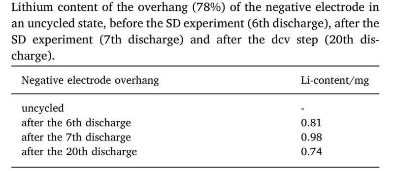 為了證實(shí)以上結(jié)論,作者做了ICP測試,測試負(fù)極overhang區(qū)域的鋰濃度,如表2所示。cc放電后鋰濃度為0.81mg,如果充電后靜置120h自放電再cc放overhang區(qū)域電鋰濃度為0.98mg,說明鋰從重疊區(qū)域擴(kuò)散到了overhang區(qū)域,放電后殘留在此區(qū)域。如果放電后再恒壓放電overhang區(qū)域鋰濃度降低,說明鋰擴(kuò)散回重疊區(qū)域發(fā)揮作用了,鋰濃度詳細(xì)分布如圖5所示。