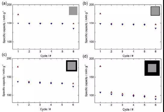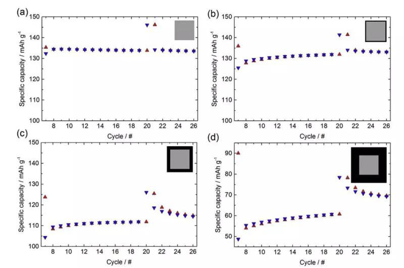 為了加速overhang區(qū)域的殘留鋰離子擴(kuò)散到重疊區(qū)域發(fā)揮作用,在20次循環(huán)放電后再加一個(gè)小電流恒壓放電,在電場作用下,overhang區(qū)域的鋰離子加速擴(kuò)散進(jìn)入重疊區(qū)域,圖3所示,之后容量恢復(fù)更明顯,而且overhang區(qū)域面積越大,容量恢復(fù)越多。