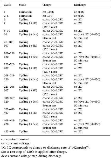 圖1是不同的Overhang設(shè)計(jì),然后按照表1程序?qū)σ陨蠋追N電池做循環(huán)測試,然后對(duì)不同階段的極片做ICP測試,研究負(fù)極極片鋰濃度的分布。表1中SD表示CCCV充電后靜置120h做電池自放電實(shí)驗(yàn),dcv表示恒流放電之后再做0.05C恒壓放電測試。