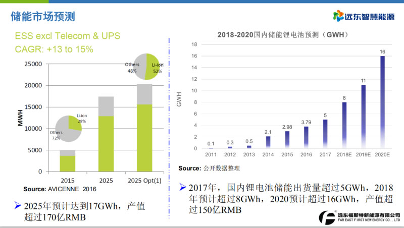 簡單介紹一下整個鋰電池市場的發(fā)展概況。這是全球鋰電池的一個最新數(shù)據(jù)。2017年全球的鋰電池是120GWh。2017年針對動力電池,中國和海外的加起來一共是57%,其他的是數(shù)碼類的,動力電池占到了絕對多數(shù)。這是動力電池的市場預(yù)測。咱們中國數(shù)據(jù)來源,2017年中國電動汽車達(dá)到了120萬量。絕對數(shù)是最多的,但是其實挪威占比最高,全國電動化率超過6%。我們預(yù)測2030年,中國動力電池電動汽車乘用車、客車、卡車分別達(dá)到26%,歐洲達(dá)到23%。2030年,中國2-3輪車電動化將達(dá)到90%。我想在2020年最后或者2030年全面電動化以后成本就不是特別大的問題。這是我們儲能的預(yù)測,給了兩個圖。一個是海外的預(yù)測,2025年認(rèn)為儲能會做到17GWh。這是一個戶用儲能,現(xiàn)在做得比較多也比較熱。尤其是歐洲或者澳洲。包括日本,基本上一年也在10萬臺到20萬臺。產(chǎn)值應(yīng)該在二三十億。