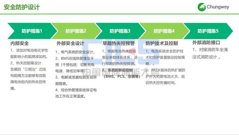 通過(guò)這些實(shí)驗(yàn)數(shù)據(jù),我們認(rèn)為整個(gè)儲(chǔ)能電站的安全防護(hù)系統(tǒng)的設(shè)計(jì)應(yīng)該是系統(tǒng)化的設(shè)計(jì),應(yīng)該同BMS、PCS、排風(fēng)或者紅外的熱成像視頻監(jiān)測(cè)等多重聯(lián)動(dòng),實(shí)現(xiàn)智慧立體的消防。遇到危險(xiǎn)狀況下,因?yàn)榧b箱受制于空間的問(wèn)題,有的儲(chǔ)能是分布式的,消防車沒(méi)法進(jìn)去,你只能使用管道有效輸送到pack或者模組當(dāng)中去。我特意加了一張汽車的,汽車就這么使用的,每個(gè)pack進(jìn)行一個(gè)防護(hù)。對(duì)于儲(chǔ)能來(lái)說(shuō),對(duì)系統(tǒng)安全融合、數(shù)據(jù)共享進(jìn)行聯(lián)動(dòng)是必然的趨勢(shì)。比如因?yàn)閮?chǔ)能電站電池起火以后,不一定是爆炸對(duì)人產(chǎn)生危險(xiǎn),可能產(chǎn)生的燃燒產(chǎn)生的毒性氣體,可能導(dǎo)致人身危險(xiǎn)。我們的主張是在每一個(gè)儲(chǔ)能里面,pack首先要進(jìn)行安全防護(hù),對(duì)電池箱單元體、電池柜、儲(chǔ)能集裝箱淹沒(méi)防護(hù)和外部消防應(yīng)急接口設(shè)置四重消防保護(hù)。每級(jí)火災(zāi)防控的火災(zāi)探測(cè)器自動(dòng)啟動(dòng)滅火,緊急狀況下可通過(guò)手動(dòng)啟動(dòng)滅火,也可通過(guò)消防主站后臺(tái)系統(tǒng)啟動(dòng)消防裝置,不同滅火介質(zhì)分階段介入。