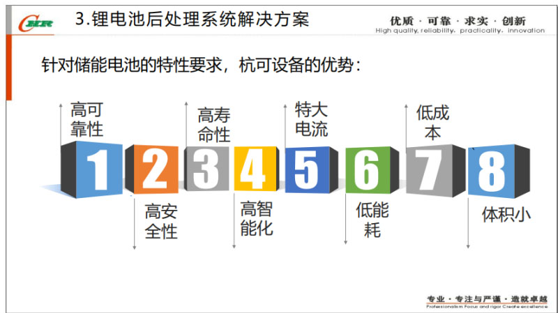 我們目前的鋰電池都是一些大電池的產(chǎn)品、大電流的產(chǎn)品、高功率的產(chǎn)品,所以對(duì)于它的能量消耗客戶是非常關(guān)注的,所以我們?cè)诔潆姾头烹娦誓壳皝?lái)講,充電效率能達(dá)到85%,放電效率回收的效率能控制在82%。為了更大的能夠讓客戶獲得產(chǎn)能的提升,我們?cè)隗w積小型化方面做了很多的努力,能夠讓目前我們?cè)O(shè)備使用的體積降低75%,就是說(shuō)空間利用率能夠更得到一個(gè)提高。