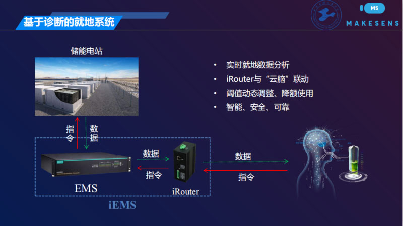 具體來說,我們的這個預(yù)防性診斷安全系統(tǒng)在華云科技在T02展臺上作為他們的供應(yīng)商展示,我們用“云腦+邊緣計算”實(shí)現(xiàn)這個功能,我們叫云原生邊緣計算,這里面很多計算放在邊緣上做,也就是說我在邊緣是實(shí)時獲取數(shù)據(jù),然后把數(shù)據(jù)扔到云端,在云端通過對幾個關(guān)鍵的電子參數(shù)在單體層面看它的數(shù)據(jù)流、它的曲線,然后建模,預(yù)測它的曲線分布,確定它的閾值,根據(jù)變化曲線看閾值在哪里,一旦實(shí)時的監(jiān)測數(shù)據(jù)要是超出閾值馬上報警。這個閾值是放在這里,動態(tài)的閾值,這個閾值是根據(jù)運(yùn)算以后動態(tài)的更新,而這個閾值另外一方面是我們可以設(shè)定關(guān)鍵參數(shù)的閾值,還可以做另外一件事情,就是你用BMS控制你的充放電的時候有一個閾值。我們知道新電池閾值肯定是沒問題的,老化了以后你還能用原來的閾值嗎?是不是可以更新一下。我們怎么更新呢?我們把這個閾值放在智能終端iRouter那里,為BMS、EMS提供按需更新的可能性。在基于就地iRouter的“云腦+邊緣計算”構(gòu)架里,EMS控制的儲能電站的監(jiān)測數(shù)據(jù)通過iRouter傳到云端,閾值動態(tài)調(diào)整,定額使用,我們現(xiàn)在是iRouter和EMS互動,以后也許可以整合在一起,成為iEMS。