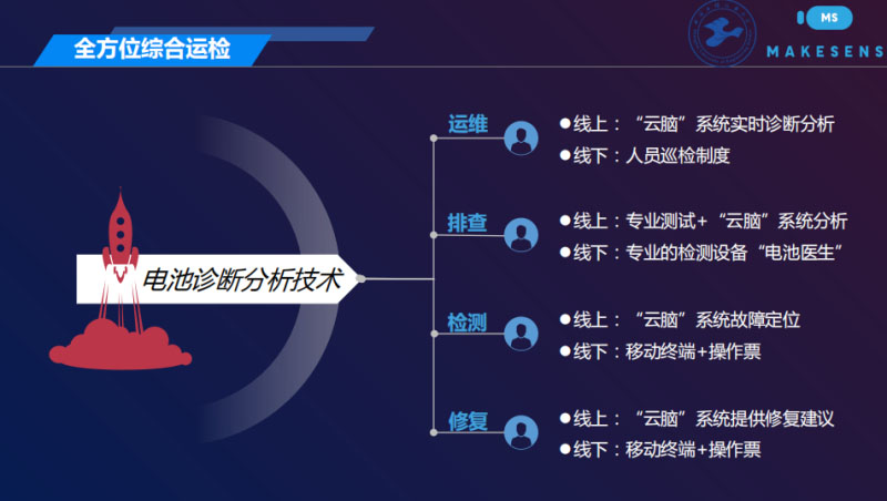 我們可以做到全方位綜合的運(yùn)檢。什么意思?運(yùn)維我們線上,線上有一個云腦系統(tǒng)實(shí)時診斷分析,線下人員巡檢、排查,線上專業(yè)的測試,加上云腦的系統(tǒng)分析,線下我們可以有專業(yè)的檢測設(shè)備,電池醫(yī)生。具體檢測,線上云腦系統(tǒng)的故障定位,線下有操作票,告訴操作工人拿到這個操作票具體去哪里帶著移動終端去做檢測,線上的修復(fù)也是我們修復(fù)建議,告訴你應(yīng)該做什么,線下就拿來操作票,拿一個均衡儀去修復(fù)一下。