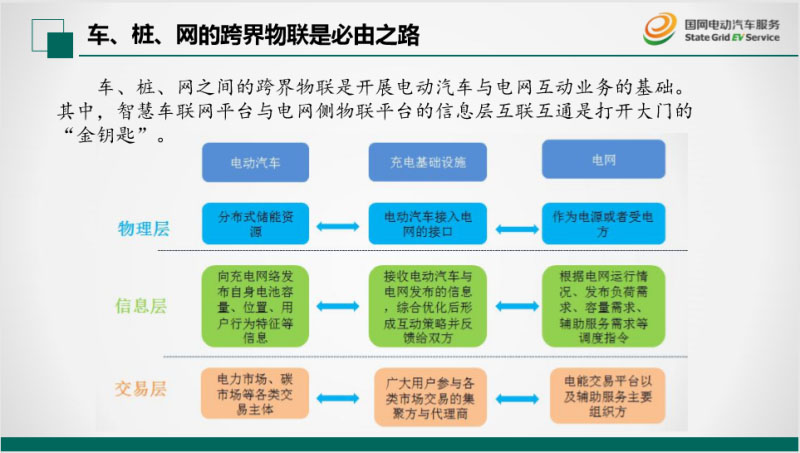 后面介紹一下泛在電力物聯(lián)網(wǎng)可以帶來(lái)什么,今年年初國(guó)家電網(wǎng)公司提出來(lái)的,非常重要的戰(zhàn)略轉(zhuǎn)型,過(guò)去主要是重點(diǎn)建設(shè)堅(jiān)強(qiáng)的智能電網(wǎng),現(xiàn)在要打造兩網(wǎng),結(jié)合堅(jiān)強(qiáng)的智能電網(wǎng)和泛在電力物聯(lián)網(wǎng)打造能源互聯(lián)網(wǎng)。要去實(shí)現(xiàn)能源互聯(lián)網(wǎng)必須要有信息跟物理的融合,通過(guò)能源互聯(lián)網(wǎng)可以去推進(jìn)整個(gè)電力行業(yè)與用戶的充分交互,打造V2G應(yīng)用是建設(shè)電動(dòng)汽車產(chǎn)業(yè)發(fā)展生態(tài)的重要一環(huán),已經(jīng)納入國(guó)家電網(wǎng)公司的泛在電力物聯(lián)網(wǎng)的計(jì)劃。