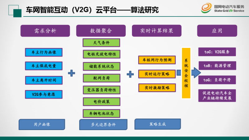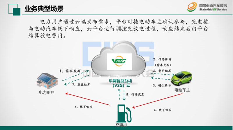 這個(gè)圖是電動(dòng)汽車與電網(wǎng)互動(dòng)的模式的路線圖,從一開(kāi)始是無(wú)序充電,就是其他專家提到隨機(jī)充電,第二個(gè)有序充電,再后面是車網(wǎng)雙向互動(dòng),最后是實(shí)現(xiàn)了車網(wǎng)一體。我們考慮的是,把海量的電動(dòng)汽車這個(gè)車載電池的資源,用作我們電網(wǎng)的巨大的電力海綿吸掉所有的多余電能,實(shí)現(xiàn)電動(dòng)汽車在在正確的時(shí)間、正確的地點(diǎn)、去充放正確的電量,從而實(shí)現(xiàn)跟電網(wǎng)的充分互動(dòng)。國(guó)家電網(wǎng)公司在車網(wǎng)互動(dòng)領(lǐng)域已經(jīng)開(kāi)展了很多工作,去年在全國(guó)多個(gè)省市開(kāi)展了有序充電的應(yīng)用試點(diǎn),今年會(huì)開(kāi)展較大規(guī)模的有序充電推廣布局。目前我們公司除了配合總部開(kāi)展有序充電業(yè)務(wù)以外,同時(shí)也在積極部署了我們的車網(wǎng)互動(dòng)業(yè)務(wù),建設(shè)了我們的V2G示范項(xiàng)目,開(kāi)發(fā)了我們的V2G應(yīng)用平臺(tái),也做試點(diǎn)的項(xiàng)目,下一步做商業(yè)化。。