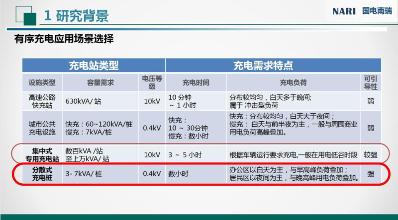南瑞公司在有序充電方面做了大量的前期調(diào)研工作,這個(gè)是有序充電場(chǎng)景研究的一個(gè)調(diào)研情況表,按照充電設(shè)備類(lèi)型來(lái)進(jìn)行分類(lèi)的。按照目前的充電設(shè)備可以劃分為:高速路快速充電站、城市快速充電站、城市專(zhuān)用充電站和分散式充電樁。高速公路還有城市的快充站,主要目的是快速補(bǔ)充電能,時(shí)間越短越好,對(duì)于有序充電的引導(dǎo)性比較弱,沒(méi)有時(shí)間進(jìn)行引導(dǎo)。對(duì)于集中式的專(zhuān)用充電站,例如公交充電站,公交公司對(duì)充電價(jià)格還是比較敏感的,他們一般的充電規(guī)律是在夜間進(jìn)行主要充電,白天利用停靠站進(jìn)行快速的電能補(bǔ)充,所以它的引導(dǎo)性相較前兩者要強(qiáng)。最后,分散充電樁主要指的是在小區(qū)或者是單位/公司停車(chē)場(chǎng)部署的交流充電樁,一般車(chē)輛停車(chē)時(shí)間比較長(zhǎng),對(duì)用車(chē)迫切度也不是很高,有序可引導(dǎo)性也是最強(qiáng)的,這也是我們研究的主要場(chǎng)景。