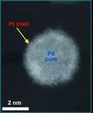 豐田與布魯克海文國家實驗室以及美國能源部合作開發(fā)了具有 Core-Shell 結構的催化劑顆粒。研究人員使用成本更低的 Pd 作為核心,通過電化學沉積方法在 Pd 核上覆蓋了一層 Pt。經過分析,這一 Pt 外殼可以達到僅有單層原子的厚度。由于 Pt 只是參與催化作用,因此主要只在催化劑顆粒表面起效,因此,在催化劑顆粒的核心用低成本材料替代 Pt,是一種顯著降低 Pt 用量并保持足夠催化劑活性的方法。