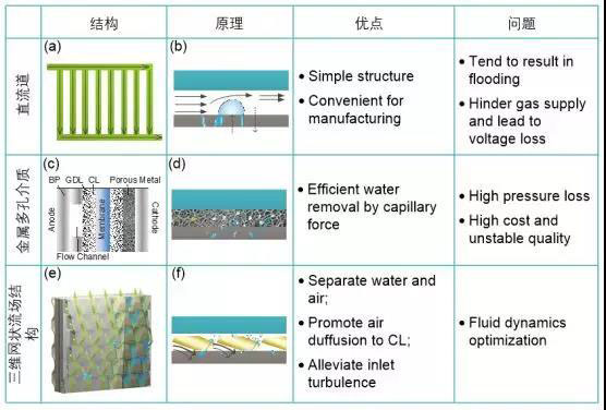 第三個是三維精細網狀流場結構,如圖 4(e)所示。流場的三維結構提供了擋板,可以有效引導空氣流向 GDL 和 MEA,從而促進空氣擴散和向陰極催化劑層的對流效果。該結構還提供了與空氣流場分開的空隙,因此工作生成的水可以從 GDL 中抽出并通過孔排出,而不會阻擋空氣傳輸。此外,三維結構可以緩解入口湍流,從而減輕膜干燥的情況。這對于自增濕系統(tǒng)也很重要。