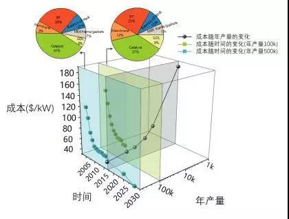 圖 2 展示的是根據美國能源部建立的成本分析模型,計算出的燃料電池系統(tǒng)制造成本的變化趨勢,以及各個關鍵組件中的成本分配。這些數據使用了基于 80 kW PEM 燃料電池系統(tǒng)的成本模型進行計算。圖中,灰色球形符號所在的灰色橫截面,展示的是燃料電池系統(tǒng)制造成本隨年產量的變化。隨著年產量從每年 1k 套增加到每年 500k 套,因為學習曲線效應,成本將顯著降低。每年 1k 套系統(tǒng)基本是當前的市場狀態(tài),而預計當燃料電池汽車市場完全發(fā)展時,將可以達到每年 500k 的產量。另一個維度上,綠色平面和藍色平面分別對應于 100k 和 500k 的年產量時,成本隨著每年的技術進步而降低的趨勢。預計到 2025 年之后,假如可以達到 500k 的年產量,那么成本可以降到 40$/kW。餅圖表示了兩種不同年產量對應的成本細分??梢钥吹剑S著產量的提高,那些制造成本占主導地位的部件,成本比例下降,如 PEM 和 GDL。相反,材料成本占主導地位的部件如催化劑和 BP,它們占總成本的比例增加。