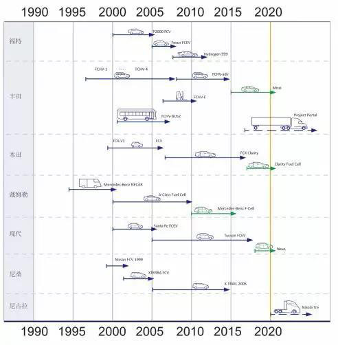 圖 1. 燃料電池概念車、原型車與量產車時間線