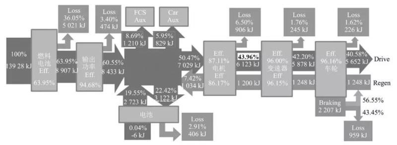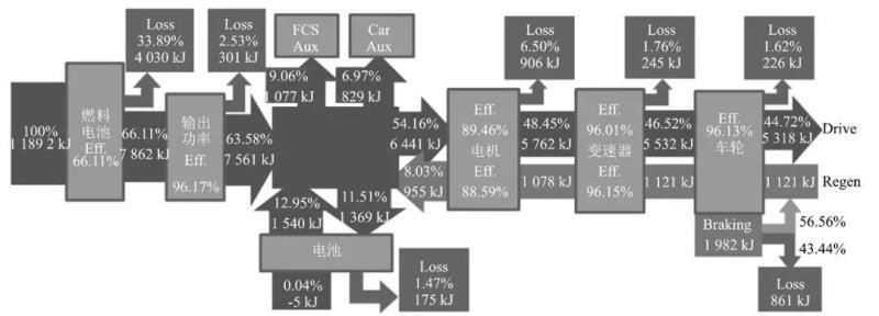 考慮提升各零部件的效率和改善整車能量分配策略,最終優(yōu)化狀態(tài)下,整車 NEDC 工況氫耗為 0.907 kg/100 km,能流圖如圖 5 所示。