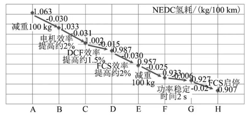 不同優(yōu)化措施后的氫耗如圖 4 所示,減重是目前降低能耗和提升動力性的主要方向之一,減重 100 kg 氫耗優(yōu)化約 0.03 kg/100 km。車輛的能量需求中效率損耗所占的比例最高,效率損耗是指各個零部件的效率損耗,包括 FC、DCF、電機等。
