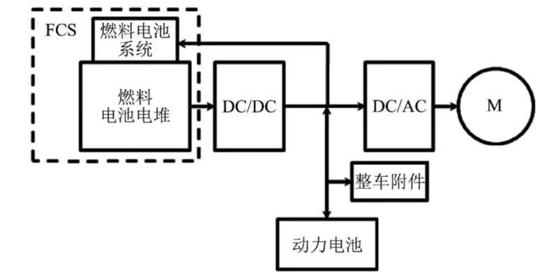 本文以上汽開發(fā)的某款燃料電池轎車為例簡要介紹燃料電池轎車的工作原理。動力系統(tǒng)結(jié)構(gòu)簡圖如圖 1 所示。