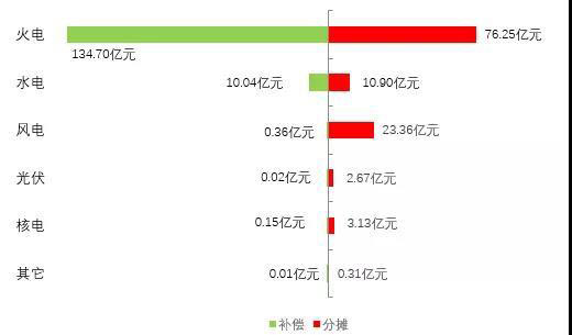 從補(bǔ)償和分?jǐn)傎M(fèi)用的對(duì)比來看,火電實(shí)現(xiàn)凈收入,而風(fēng)電光伏為純支出。盡管火電分?jǐn)傎M(fèi)用達(dá)到76.25億元,占全部分?jǐn)傎M(fèi)用的比重為65.4%,但是獲得補(bǔ)償后,實(shí)現(xiàn)凈收入58.45億元。與火電對(duì)比鮮明的是風(fēng)電,分?jǐn)傎M(fèi)用23.36億元,占比為20%,純支出23億元。光伏分?jǐn)傎M(fèi)用占比小,占比為2.3%,純支出2.65億元。