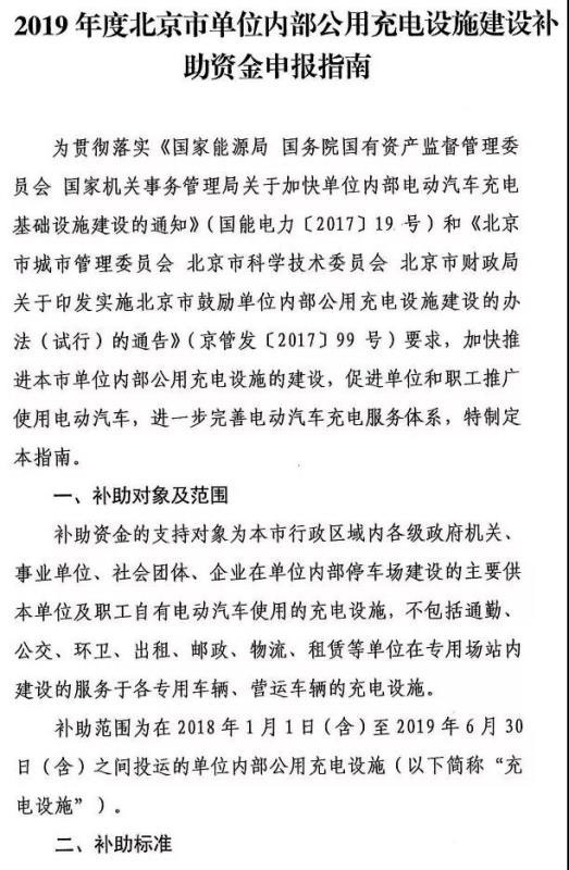 北京市城市管理委員會5月9日發(fā)布《2019年度北京市單位內(nèi)部公用充電設(shè)施建設(shè)補助資金申報指南》。
