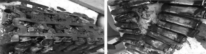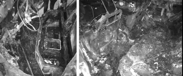 經(jīng)查該車GPS監(jiān)控?cái)?shù)據(jù),車輛在早晨4點(diǎn)左右電池單體溫度開始上升,至5點(diǎn),單體溫度升至126℃,之后無數(shù)據(jù)上傳,未發(fā)現(xiàn)外部火源存在。對車輛進(jìn)行勘查,無線束短路點(diǎn)存在。動(dòng)力電池拆解,熔斷器正常,排除外部電路短路引起電池包失效的可能性,內(nèi)部低壓線束破損(圖4)。