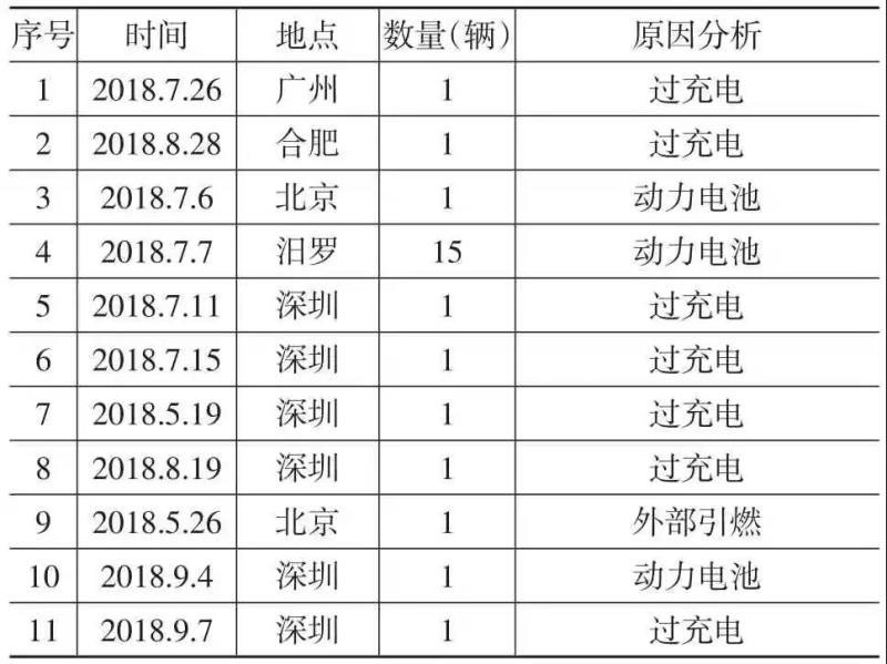 根據(jù)媒體公開報(bào)道和業(yè)內(nèi)人士資料提供(企業(yè)和車型信息不再顯示),2017年至2018年底的不完全統(tǒng)計(jì),國內(nèi)共發(fā)生新能源汽車安全事故超過59起、涉及汽車超過153輛(見下表)。