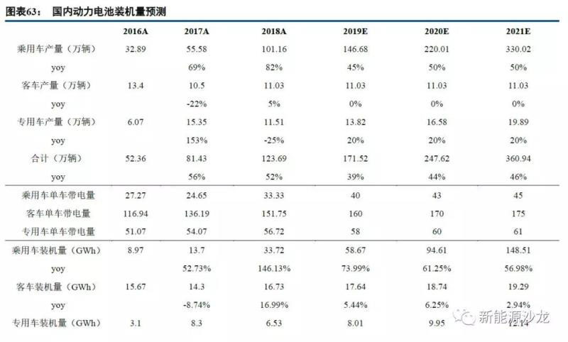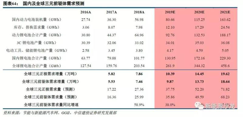三元正極材料的應用主要集中在動力電池中的乘用車上,此外還有少部分用于3C消費與儲能領域。2014年以來國內新能源汽車產銷量的快速增長,帶動了車用動力電池產量及裝機量的快速增長,根據(jù)中國汽車工業(yè)協(xié)會和GGII披露數(shù)據(jù),2018年新能源汽車產量、車用動力電池裝機量增長率分別達到52%、57%。隨著新能源乘用車產銷量持續(xù)爆發(fā)式高增長,新能源客車產銷量保持平穩(wěn),新能源專用車保持較快增速,我們預計2019~2021年國內動力電池裝機量增速分別達到48%、46%、46%。