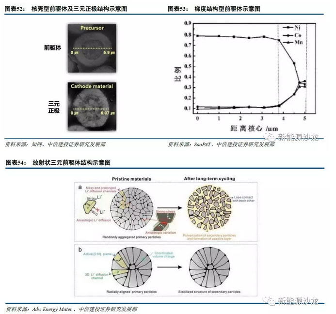 除單晶、高鎳化趨勢對前驅體制備工藝提出的新挑戰(zhàn)外,一些特殊結構前驅體也在不斷發(fā)展中。比如放射狀生長而成的前驅體,可制備出放射狀結構正極材料,內部可形成由內到外的鋰離子擴散通道,從而表現(xiàn)出優(yōu)異的倍率性能;比如內高比容量、外層高穩(wěn)定性的核殼結構或梯度結構,既能發(fā)揮內層材料高比容量特點,又能提升充電截止電壓和循環(huán)穩(wěn)定性;比如摻雜型前驅體,通過共沉淀方式將摻雜步驟從后道正極燒結轉移到前道前驅體合成,相較于火法摻雜,濕法可以獲得更好的摻雜均勻性。