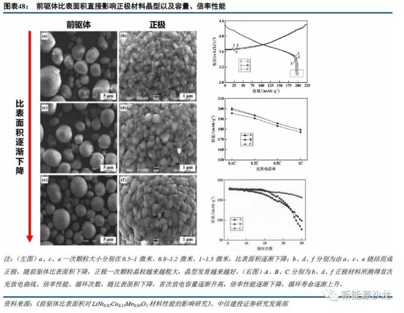 2)前驅體比表面過大,導致經燒結后生成的正極比表面積過大,一方面導致正極振實、壓實密度下降,鋰電池能量密度下降,同時正極材料與電解液界面反應加劇,電池循環(huán)壽命下降;另一方面由于空隙變多,鋰離子傳輸通道變多,電池倍率性能提升。